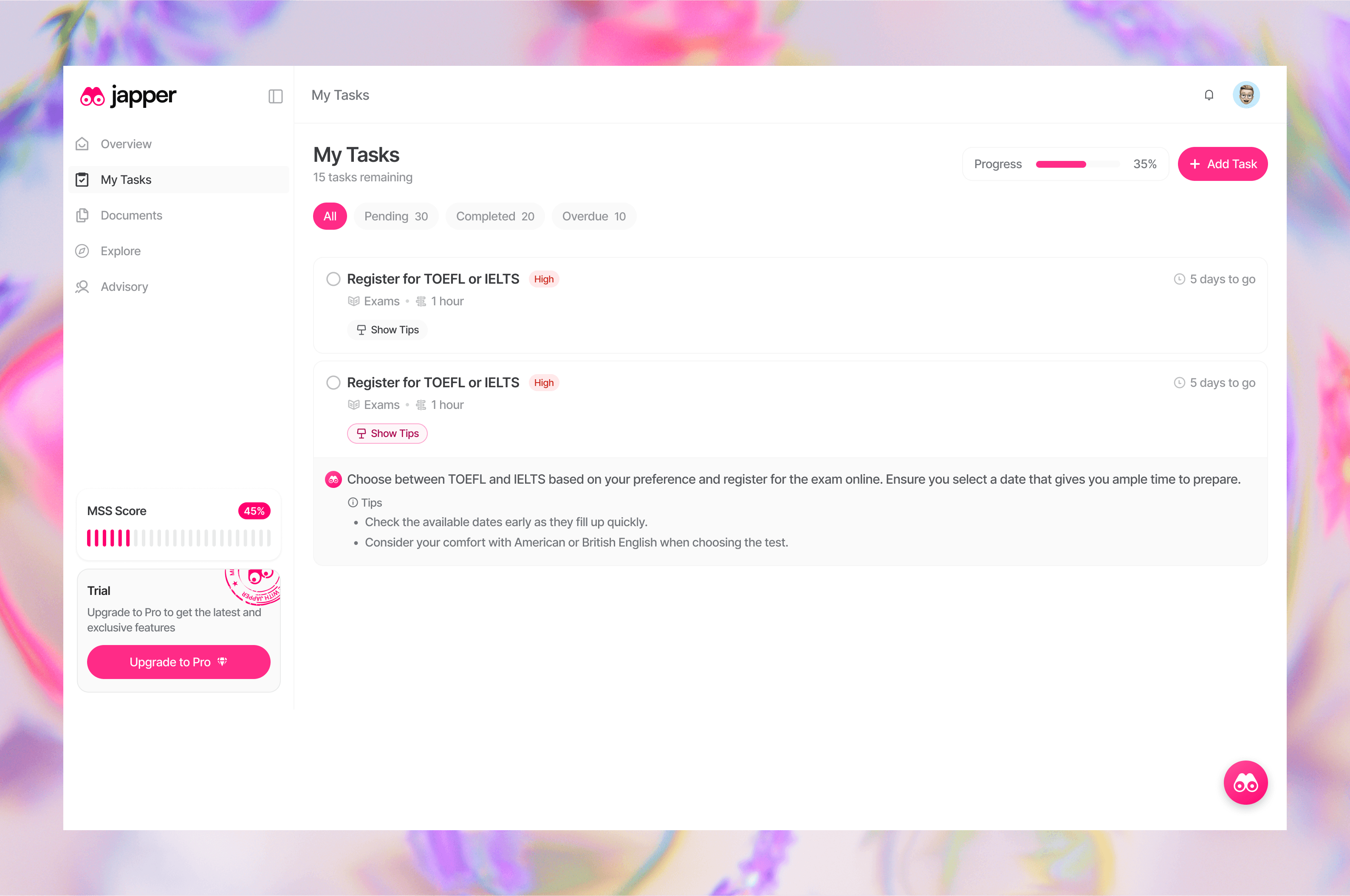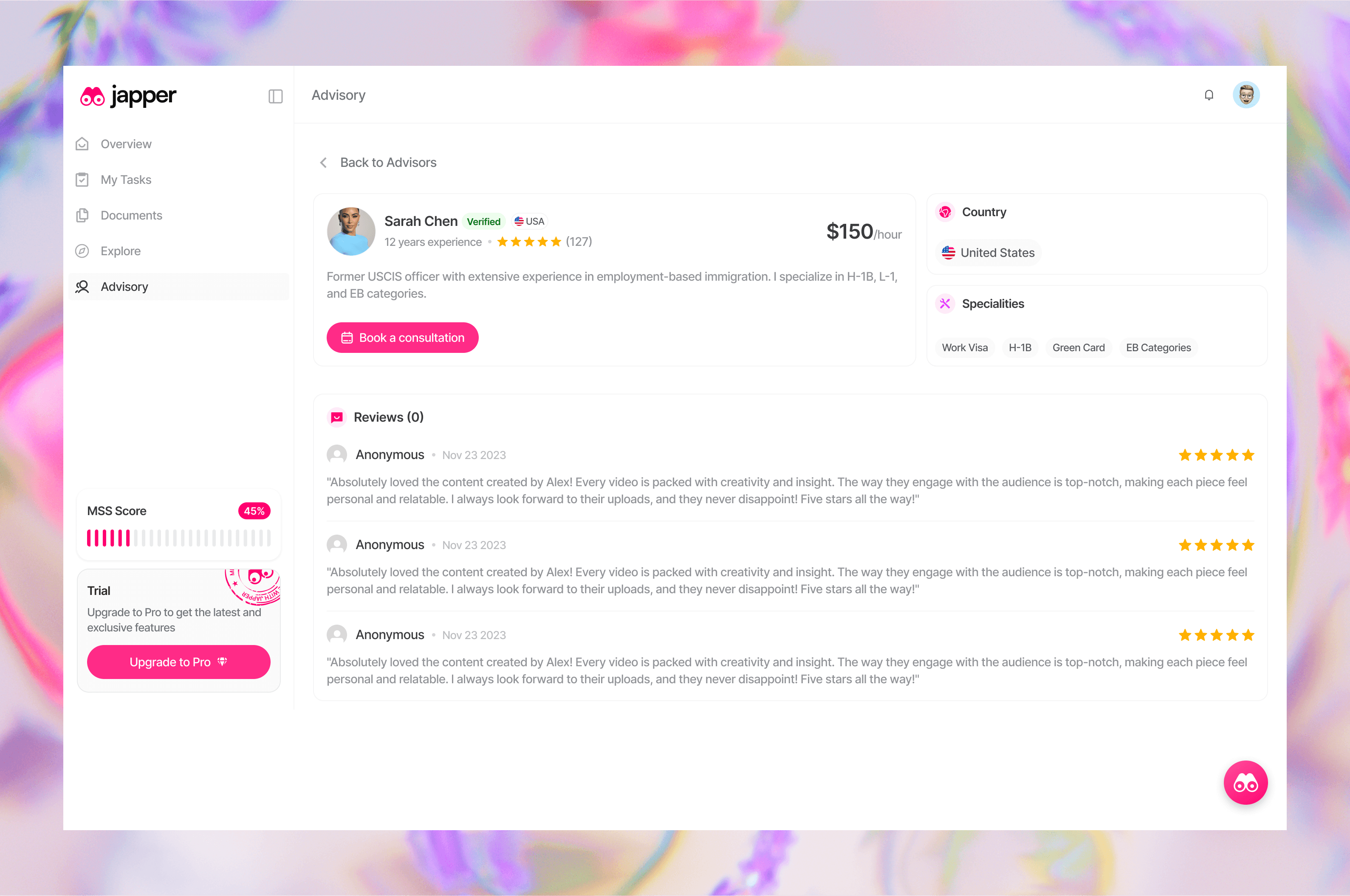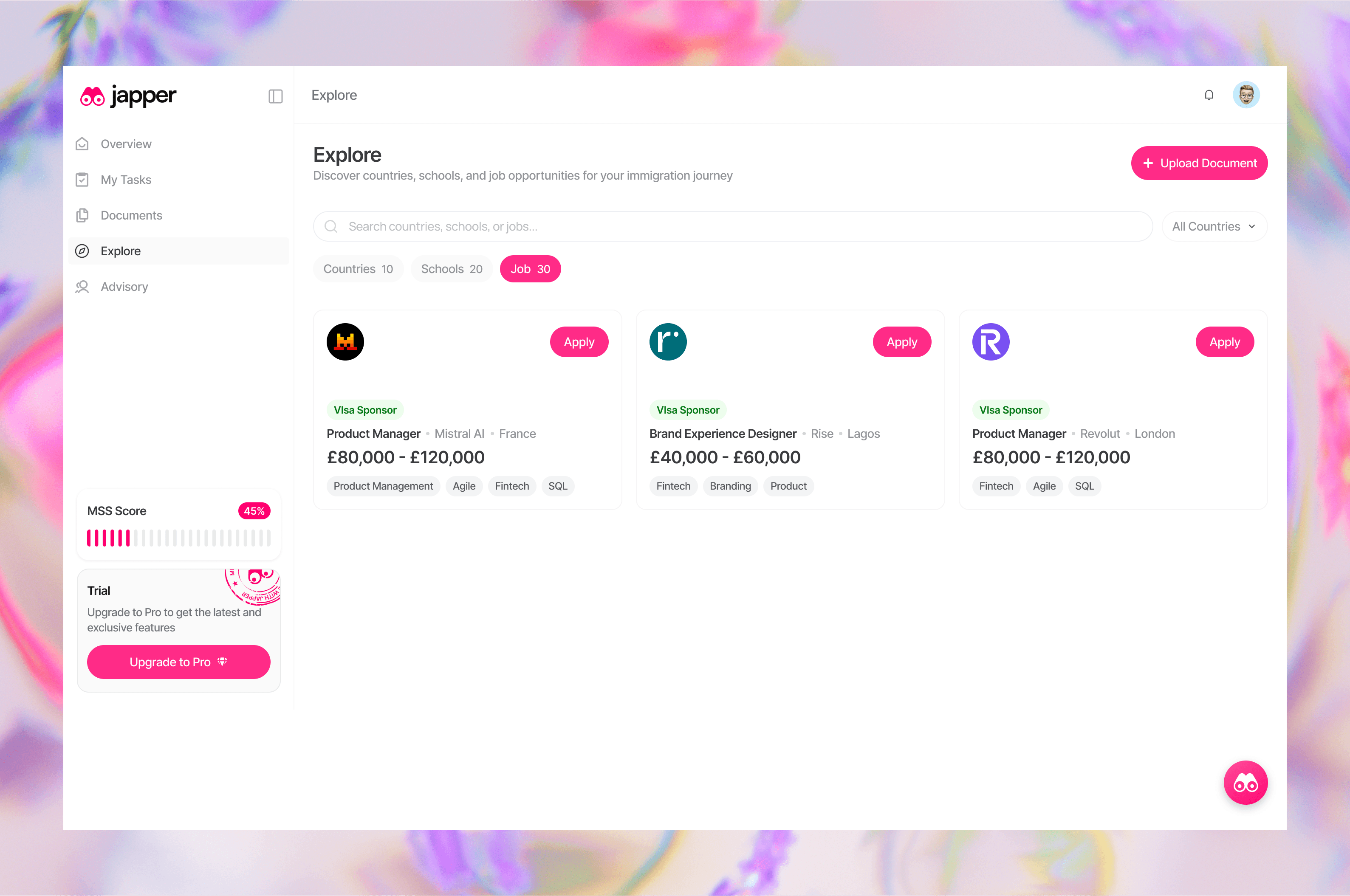 Japper is an immigration companion platform that helps people navigate the process of moving to a new country. It matches users to the right visa pathway based on their goals, then gives them a structured workspace to complete that journey — tracking tasks, organizing documents, connecting with verified consultants, and accessing community reviews, all in one place.