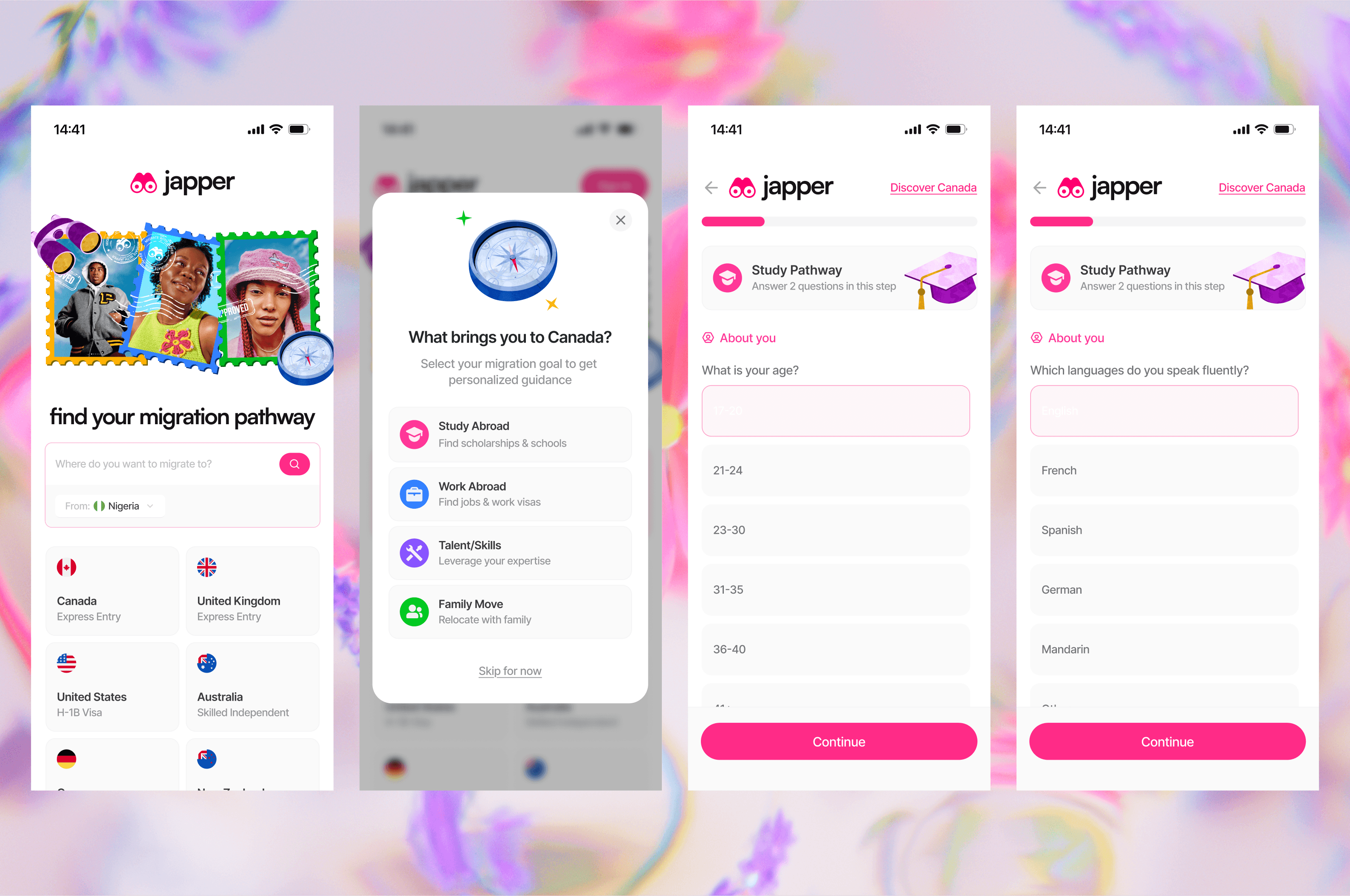 The landing page leads with a single promise — "find your migration pathway" — and immediately backs it up with destination countries and immigration programmes. The decision to surface real options before asking users to sign up is intentional: it lowers the barrier to entry by showing value first. The quiz modal that follows ("What brings you to Canada?") frames a complex eligibility question as a simple, human one — turning what could feel like a form into a conversation. Each answer option is written in plain language, not legal terminology, which signals that this platform was built for the person, not the bureaucrat.
